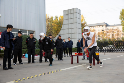 保衛(wèi)部微型消防站隊員需完成原地著消防防護(hù)服、佩戴自救呼吸器30米滅火、一人兩盤水帶連接操。原地著防護(hù)服,隊員在聽到“開始”口令后迅速穿戴防護(hù)服、消防靴、消防頭盔、扎安全腰帶。佩戴自救呼吸器,在起點(diǎn)處完成空氣呼吸器的佩戴,隨即提起4kg干粉滅火器快速到達(dá)距離30米處的指定區(qū)域進(jìn)行滅火。一人兩盤水帶連接操,隊員迅速甩開***盤水帶,一端接到消火栓接口,另一端接到第二盤水帶,在行進(jìn)中接上水槍到達(dá)終點(diǎn),完成比賽。